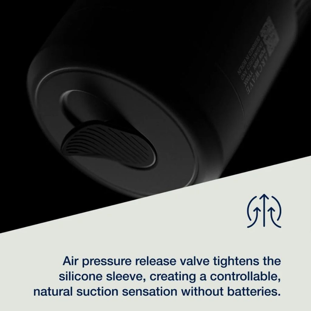 Zawór zwalniający ciśnienie powietrza zaciska silikonowy mankiet, aby stworzyć kontrolowane, naturalne odczucie ssania bez baterii. Kładąc palec na zaworze spustowym powietrza podczas użytkowania, możesz kontrolować intensywność ssania dokładnie według własnych upodobań, aby uzyskać całkowicie naturalne odczucie, które można dostosować.
