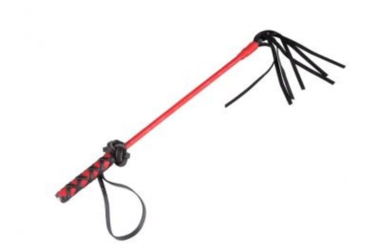 Czerwony bicz z frędzlami. Długość drążka: 50 cm.