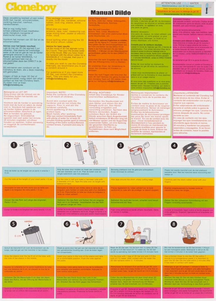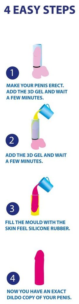 Zestaw składający się z (jako zewnętrzna osłona zestawu) formy, paska na penisa, mankietu, butelki z utwardzaczem, 2 x żel 3-D, gumy silikonowej, 1 pary rękawiczek plastikowych, drewnianej szpatułki, szczegółowej instrukcji użytkowania.