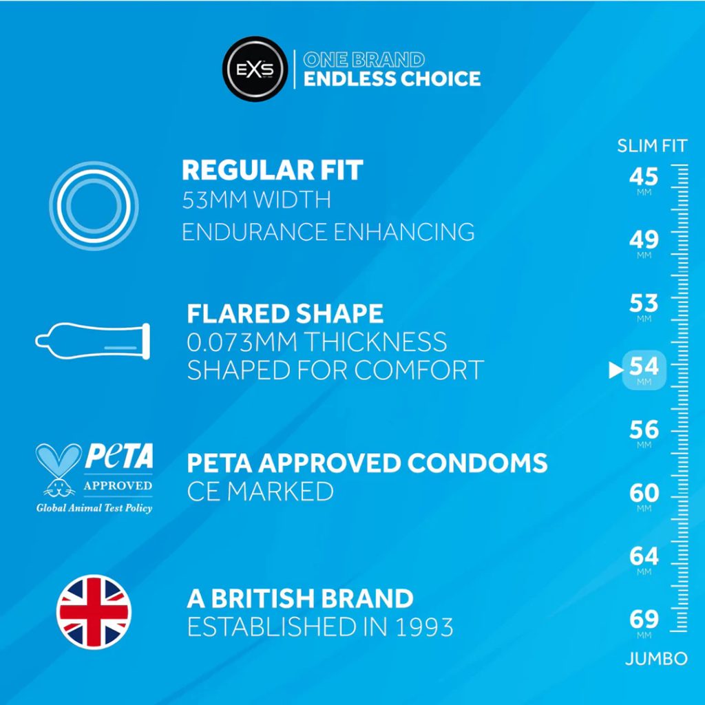 Prezerwatywy EXS Endurance Delay mają prostą ściankę 53 mm i są wykonane z naturalnego lateksu. Każda prezerwatywa jest nasmarowana na zewnątrz, a wewnątrz ma środek znieczulający 1% lidokaina, który należy wmasować w główkę prącia. Z prezerwatywami EXS Endurance Delay możesz wytrzymać dłużej podczas uprawiania seksu!