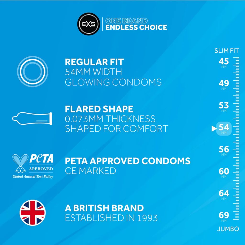 Wyjątkowa świecąca prezerwatywa od EXS! Zmień swojego penisa w miecz świetlny! Nie umieszczaj prezerwatywy fluorescencyjnej w silnym świetle przez 30 sekund. Załóż świecącą prezerwatywę i rozjaśnij brzuch swojego partnera.