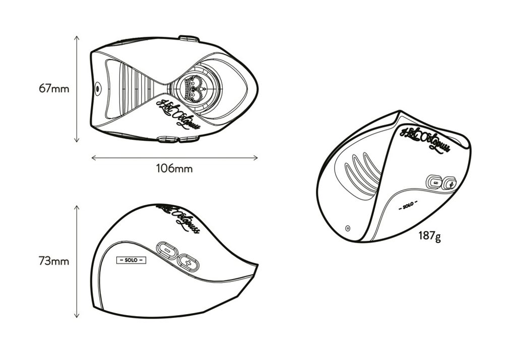 Długość całkowita 10,6 cm, szerokość 6,7 cm, wysokość 7,3 cm. Silikon ABS.