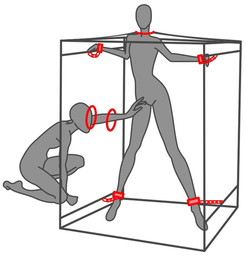 W środku znajdziesz miękką matę podłogową, 2 wentylatory dla doskonałej wentylacji i oświetlenie LED, które delikatnie rozjaśnia ciemność. W zestawie znajdują się także miękko wyściełane kajdanki na ręce i kostki, które można umieścić według własnych upodobań. Zapięcia na sprzączki umożliwiają szybkie zakładanie i zdejmowanie.