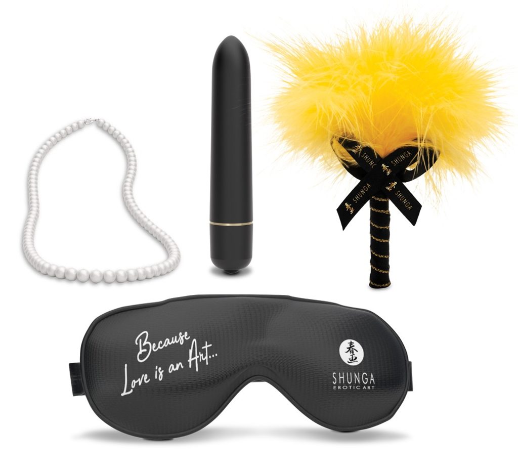 4 zabawne akcesoria (mini wibrator, naszyjnik z pereł, opaska na oczy, piórko do drażnienia)