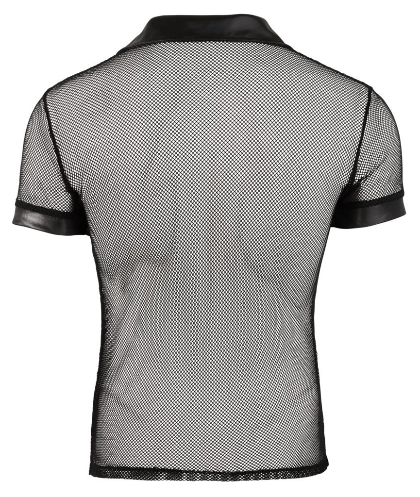 To męskie polo przyciąga uwagę zmysłową kombinacją przezroczystej siateczki i błyszczącego materiału wetlook. Posiada kołnierzyk polo oraz zapięcie na zatrzaski, które kończy się na wysokości klatki piersiowej, co naturalnie podkreśla górną część ciała i tworzy prowokujący efekt.