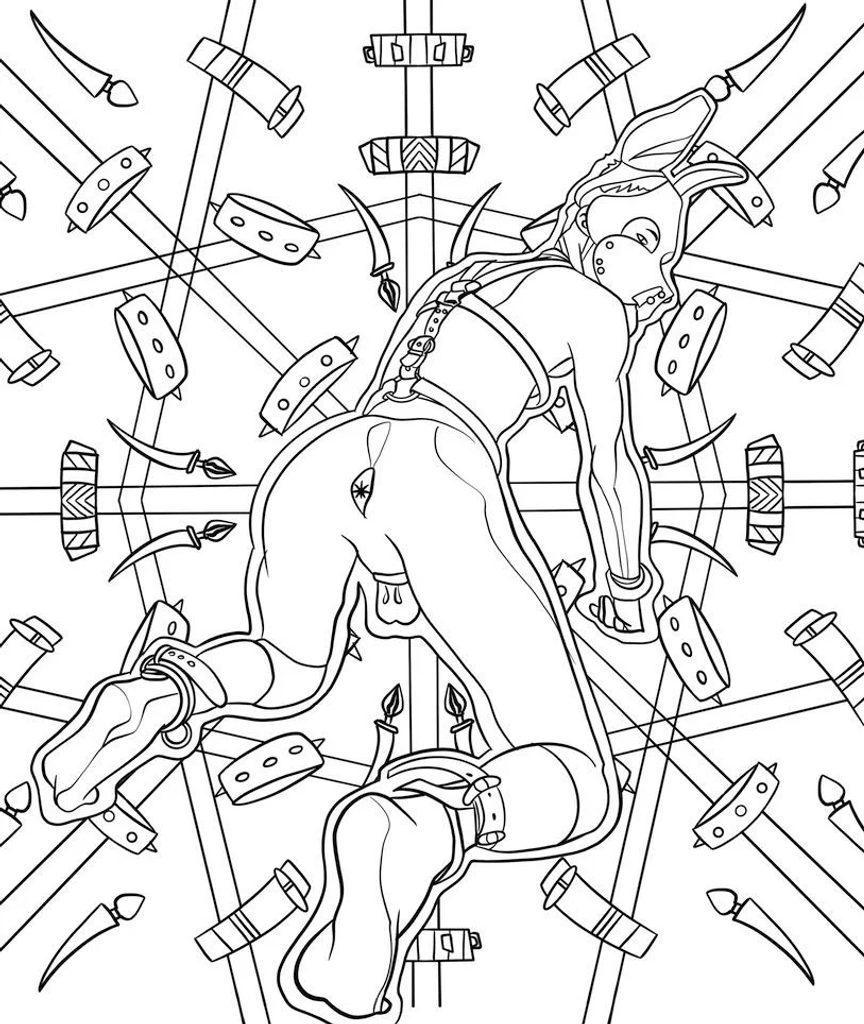 Kolorowanki antystresowe zawierają szczegółowe ilustracje różnych motywów BDSM, takich jak: wiązanie, lateks, gagi i wiele innych.