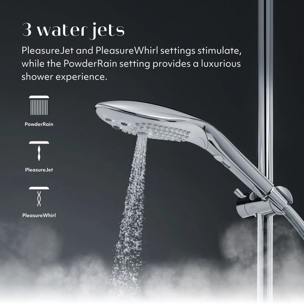 Przełączaj się pomiędzy ustawieniem PowderRain, aby uzyskać luksusowy prysznic, zmysłowym masażem PleasureWhirl i silną pulsacją PleasureJet.